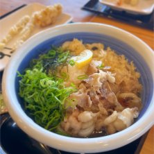 島根和牛のぶっかけ肉うどん! 美味い。^ ^ 今日は暑いくらい。冷たいうどんが丁度よい。