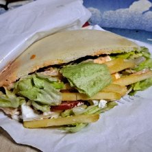朝御飯 その① 【UberEats/エフェリフケバブ】 ①チーズサンド 750円 ピタパンにリコッタチーズ、フライドポテト、トマト、レタス、ニンジンを盛ってソースを掛けてます♪