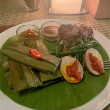 バリプレート 蓮根の葉で包んで蒸したご飯 ちょっと変わった味付け 笑 チキン🍗が抜群に美味しかった。 柔らかくほろほろで、作り方教えてもらいたいぐらい。❤️❤️ オットは違うやっぱりバリプレート ナシゴレン?バリ風チャーハン? 添えてあるナッツ🥜と一緒に食べるのだけど、美味しかった〜 添えてあるサンバルが辛い辛い🌶️ でも美味しい〜癖になる〜