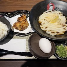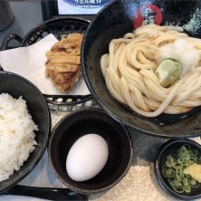 冷やしうどんぶっかけランチ。鶏唐揚げと玉子かけご飯で。