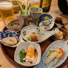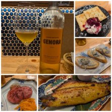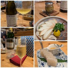 8月15日の2軒目はワイン飲みたくて移動 18時までは全てのボトルのワインが半額です オレンジワインで乾杯 つきだしはクリチ&クラッカー しらすとブルーチーズのブルスケッタ 雲仙ハム 鰆の西京焼き ブルスケッタはしらすの生臭い感じとブルーチーズがちょっとこのワインとは合わずミスチョイスでした💦 ほかはワインにも合うし美味しかったです