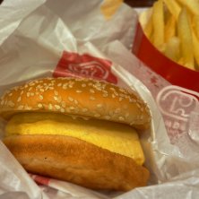 東大島のドムドムにきました。 高校のとき地元のダイエーでお世話になったわ ポテトが美味しかったんだよなー と、思っておさつバーガーとフライドポテトの🍠🍟セットにしたぞ