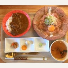 ランチに初来店のお店🤩 ローストビーフ丼とカレーのハーフを注文😋 丁度お昼時で、お店は賑わっていました☆ ローストビーフ丼は、薬味のわさびをつけて食べると、味変し更に美味しく、カレーは牛すじ肉が柔らかく煮込まれていて、どちらもホントに美味しかったです🙏 帰り際に、な、なんと、有名な似顔絵のイラストレーターさんにお会いでき、握手、記念写真も撮らせていただき、超感激でした😆 とてもいい時を過ごす事ができました👍 感謝🙏