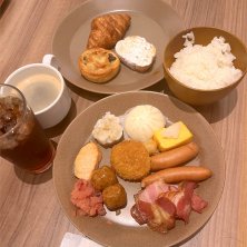 海老ニラ焼売を正面にと蓮根や紅芯大根の向きを意識して盛り付けたのに、皿の向き変えるの忘れて撮ってしまって見えない😅 苺とバルサミコのドリンク、茹で鯛飯、けんちん蕎麦、大粒でふっくら柔らかい黒豆納豆が美味しかった❤️ 味噌汁や梅干が激しくしょっぱいのはご当地仕様? 納豆3種類あって全部食べたかったけど、この私がご飯1膳でお腹いっぱいになってしまった😭 昨夜食べすぎか? 歳のせいか?いや、とーちゃんも珍しく控えめだったし、きっと朝食会場が暑いからだ🥵 まだ土曜だなんて夢みたい❤️