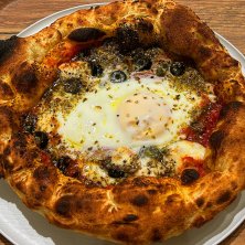 エッグマン。うっま〜! 東京の店は予約取りにくいみたいだけど、ここは土曜日の昼でも席のあるフードコートで簡単に食べられて良かった。生地がユニークなピッツァ。