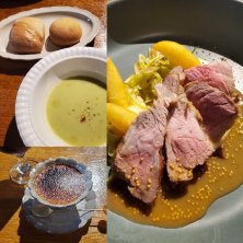 豚肩ロースのロティ、ブロッコリーのポタージュ、クリームブリュレ