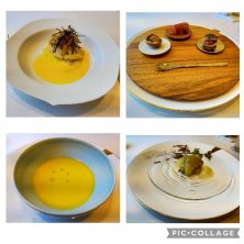 年に1度の自分へのご褒美 去年もお邪魔したシェフのお店 新たにレストランとカフェをOPEN やっと伺えた😄 静かな森の中に佇む素敵なレストラン いつも野菜を求めて来て下さるシェフ 申し訳ないほどのサービスをして頂いた🙇🏻 本日のメニュー ✨本日の小さな前菜 ✨小メロンとアオリイカ、ブラウンマッシュルームの軽い炙りのサラダ ✨本日のポタージュ ✨天然スズキのポワレ アンディーブのクーリと長葱のソテーサフランのソースで 🦑がこんなサラダに😱 うちの店の🎃と長葱だ😁 次へ