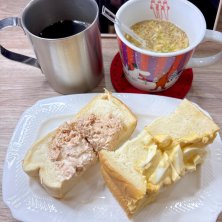 お昼~(*´罒`*) ツナサンド&たまごサンド このお店サンドイッチ屋さんで スタートしたけど 平日はナポリタンなどの喫茶メニュー になりサンドイッチは土日祝限定に なってしまった🙄 色々な組み合わせあるけど ツナとハンバーグの組み合わせ ないな~と聞いてみたら ¥900や¥1000だと合わなくて セットに出来ないとの事でした お店で両方頼んで半分食べて 半分お持ち帰りにするしかないと😅 まあ、そこまでしてはいいかな🫢