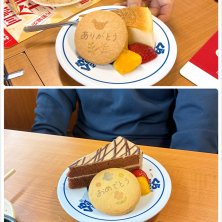 くら寿司で頼んだ『おめでとうスイーツ』と『ありがとうスイーツ』 お父さんにはお誕生日おめでとう🎂 お母さんにはありがとうスイーツを頼みました。 キラキラ光る汽車ポッポと『注目』と書かれた電光掲示板が一緒に回転レーンに流れて来て、ケーキが席の前に来ると自動的にパカっと開いてケーキが登場します。 お父さんお誕生日おめでとう お母さんいつもありがとう