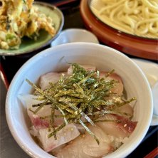 桜島道の駅にて ●小みかんうどん🍊 みかんの良い香りがとっても美味😋 ●ミニかんぱち丼 かんぱちは歯応えが良くて美味しかった ●がね天(さつまいもの天ぷら)