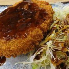 コロッケにソースドボドボかけます(笑)☀️😵💦(`Д´≡`Д´)??キャベツもソースたっぷりwww
