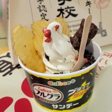 🛩️新千歳空港のカルビープラスのお店で、娘が並んで買った 「フルグラブラックサンダーサンデーポテトチップス付き」数量限定 美味しいそうなので写真撮りました😆