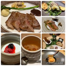 ・山形赤根ほうれん草のナムル 山形牛の厚切りハム 庄内産三元豚のリエット 山形の食用菊 ごぼうの赤ワイン煮 ・赤ピーマンのムース ・柿とサーモン ~りんごの木のスモーク~ ・根菜の黄金スープ ~コンソメ仕立て~ ・森にやさしい鹿肉のサラダ仕立て ・金目鯛のポワレ ~バルサミコソース~ ・山形牛のステーキ ・お釜で炊きあげる炊き込みご飯 生味噌仕立ての味噌汁 お漬物 ・木いちごのパンナコッタ 2025/01/12 夕食