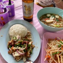 バンコク食い倒れ旅 チャトチャック市場で晩御飯 トムヤンクンヌードル 豚串焼き カニチャーハン マンゴースムージー ここのトムヤンクンは豚肉も入った。