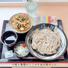 ランチ…ゆで太郎😃 季節のかきあげ… 小柱と春菊のミ二かきあげ丼セット😋 もりそば…わさび…すりごま…一味唐辛子… の味変で楽しんで…そば湯😋