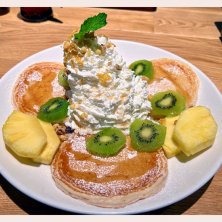 今日のランチは船橋でパンケーキ😃 パイナップルホイップパンケーキにキウイを追加して1,210円+税♫ ハワイ風のメニュー、美味しいですね😋