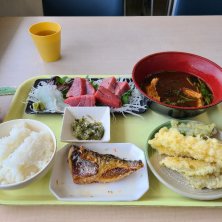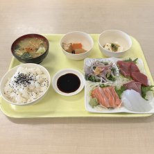 とある、日のお昼ご飯は 神戸市中央卸売市場 東部市場内にある食堂へ 安定のお刺身定食1180円 (鰹のタタキ、マグロ、ハマチ、イカ、サーモン) ごちそうさまでした( ^ω^ )