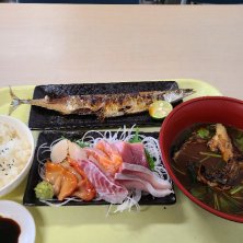 9/30 定食(生さんま塩焼大、刺身盛り合わせ、あら汁、ご飯) 1,500円 無料駐車場もあり関係者以外も入店できる社員食堂?みたいな店
