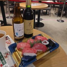お昼ごはん 万博フードコートで すしとビールと赤ワイン