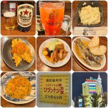 とある、日の夜ご飯は 大阪京橋のスタンディングパブ ワシントン食堂さんへ サッポロ赤星大瓶🍺 メガトマトサワー🍅 玉子ポテマカ🥚 穴子の名前一本揚げサルサソース💃 ワシン豚テキ🐽 オイルサーディン🐟 ビリヤニ風炒飯🍚 食べすぎでごちそうさまでした( ^ω^ )