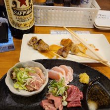 8/24昼① とり刺し盛り合わせ 550円、おまかせ焼き鳥5本盛 385円、ビール大瓶2 439円×2 もう何十回もこちらの系列は行ってますが大体この組み合わせ