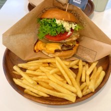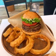 チェダーチーズバーガー+オニオンリングセット 淡路島産の100%有機肥料で育てた完熟玉ねぎ「蜜玉」が入った、ビーフ100%の本格バーガー。ビーフの肉汁と厚切りトマト🍅や厚切り玉ねぎ🧅がオリジナルのBBQソースと絡み、とてもジューシー。時折りHEINZのケチャップやマスタードで味の変化も楽しめます。カリッと揚がり甘味たっぷりのオニオンリングも圧巻で、玉ねぎを半玉ぐらい使っているのではないでしょうか。セットの飲み物は島レモン🍋ソーダを選びました。