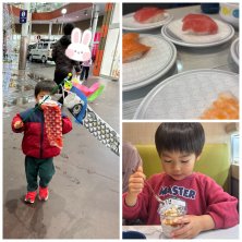 2026.4.1 お夕飯 息子リクエストのお寿司🍣 回転寿司は、子連れも行きやすくて助かる! お寿司の写真は、息子カメラマンが撮影しました ダイソーの鯉のぼりを買ったら大喜び… 安上がり…(笑)