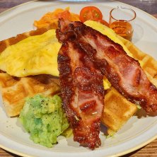 ランチはベーコンとオムレツのせワッフル、 アボカドディップもついて美味しかったです
