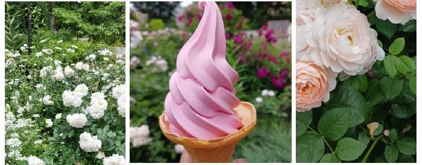 薔薇ソフトクリーム 薔薇の咲いているうちに、散歩がてらローズガーデンへ(*^^*) 散歩に丁度良いお天気🎵 ランチはソフト😁。