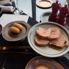 今月大阪にオープンした『パティーナホテル』の18階のバスク料理のレストランにてランチです。目の前に大阪城が見えて眺めは最高。料理もいわゆるフランス料理とも違う料理が出て来て美味しかったです。メインは前菜は燻製したカツオ、フォアグラの入ったパスタ、主菜はチキングリルが出ました。
