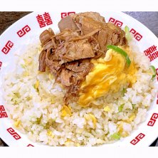 埼玉県さいたま市浦和区 北浦和駅の付近に有る炒飯の専門店、幸せの炒飯のとろ玉チャーシュー炒飯。100gのチャーシューととろとろの卵が乗った炒飯で、この店の1番人気メニュー。セットでスープ(ラーメン)かドリンクの何れかが付く。炒飯のお供にはやっぱりラーメンと思い、スープにした。卵が苦手の為、初めはどうしようか迷ったが、炒飯とならイケると感じこれに。味は美味かったけど、しょっぱかった。量が有るんで、少食の人には多いと思う。その為、何人かの客が余った分を持ち帰りにしてたのを見かけた。