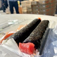 海鮮巻き380円 マグロ解体ショー後、ジャンケンして勝ち抜くとカマと中落ちをタダで貰える! 三度めのチャレンジで、遂に中落ちゲット!(ツレが…)