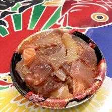 漬け丼398円 サーモン、まぐろ、イカ、かつおが ご飯と同量…いや、倍近く入ってるんじゃないかと思うくらい 切り落としの魚がたっぷり入ってました! 市場楽しい😀