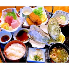 宮城県宮城郡松島町 松島海岸駅と松島の付近に有る海鮮料理の店、かきと海鮮料理 旬海の旬海御膳。 松島湾で取れた焼き牡蠣、カキフライ、牡蠣の南蛮漬けに刺身、御飯、味噌汁、漬物、醤油とソースがセットになった定食。 松島は牡蠣が有名な場所。松島で観光のついでに、予めオススメの店を調べたらこの店を見つけたので、ここで昼食を食べる事にした。色々な牡蠣や刺身迄付いていたんでこの定食にした。牡蠣はフライと南蛮漬けは美味かったが、焼き牡蠣は後味が若干嫌やった。刺身は新鮮さが有った。