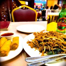 肉絲炒麺 12.80£、素春捲 6£と青島ビール
