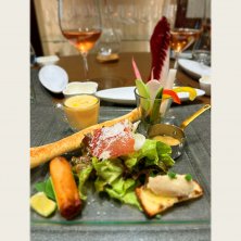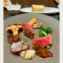 ・栄螺 茸 大蒜 バター ・千葉県産 鱸 森田農園の朝採れ野菜 ・フォアグラ フラン コンソメジュレ ・小笠原諸島 尾長鯛 オマール海老フリット ソースヴァンブラン トマトバジル ・埼玉県産 牛フィレ 流山野菜 ペリグー トリュフ ・ポモドーロ スカモルツァチーズ ・フランボワーズソルベ マンゴーソルベ ロールケーキ 果実 ペーシュドベーニュ 2025/09/03 夕食