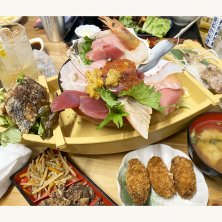 千葉県松戸市 北小金駅と五香駅の付近に有る海鮮料理と居酒屋の店、鬼平せんぎょてんの特上海鮮ちらしとまぐろメンチ。 豊洲市場鮪屋仲買人の直営店で、豊洲市場で仕入れた新鮮な魚介類が味わえ、メニューの種類も豊富である。居酒屋として食べる事も出来る。 御飯の上に赤身、中トロ、甘海老、サーモン、烏賊、蛸、雲丹、イクラ、コハダ、穴子、鮪の炙り、玉子焼きなどの具材を豪快に乗せたどんぶりで、味噌汁と小鉢がセットで付く。また、まぐろメンチは別途110円出して食べた。ネタが新鮮でとても美味かった。