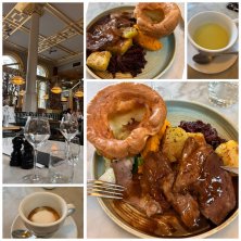 サンデーロースト 私はラムで次女はビーフ 食後にマキアートとミントティー せっかくの日曜日なのでサンデーロースト、ヨークシャープディング、グレービーソース、スクワッシュマッシュ、紫キャベツのビネガー蒸、ローストポテトがついて満腹です。 グラスワインもついています。