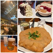 ビール シュニッツェル マッシュルームのソース シュバルツバルトキルシュタルト ライスプディング 顔より大きいシュニッツェル!半分こして良かった。ガーゼに包まれたレモンで大きさがわかります。