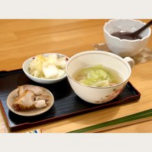 キャベツと山形ウィンナーのスープ 自家製地鶏の燻製 白菜の塩レモン漬け 振舞いおしるこ