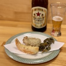 天ぷら 海老、岩のり、鱈の真子の煮付け