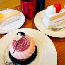 お休みの日のおやつ 桜のケーキ いちごショート ベイクドチーズケーキ シェアして色々な味を楽しみたいタイプ😊 こちらのお店はスポンジと生クリームが特に美味しいのでイチゴショートは外せない。 基本のきです😍 うーん、ふわっと口の中での溶け方が素晴らしい👍 桜のケーキは中は桜のクリームと抹茶。コントラストが絶妙でした。 あー、人間ドック終わって今日は色々解禁してます😊