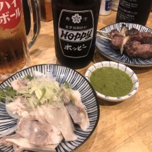 余りの蒸し暑さで王子駅近のもつ焼き 「はる」でホッピーとガツ刺はニラ白醤油 カシラたれで一息 強面のスタッフだが接客は星三つ。