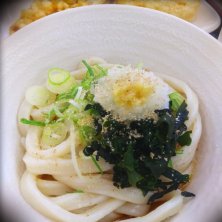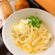 釜玉うどん小@330円を頂きます! 卵とおうどんが混ぜられた状態でおばちゃんから受け取ると、卵がカルボナーラ化しててビビる!うまい!