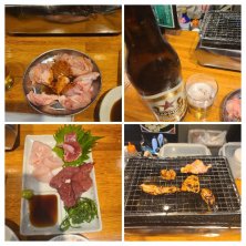 12/29 サクッとはしご② オアシスセット(鶏焼肉4種盛、ビール大瓶) 1,100円、鶏刺身3種盛 650円 ほんと安いわ