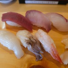 手前から🍣🐱 いか・げそ・甘えび まぐろ・はまち・しまあじ シャリは小さめ しまあじ肉厚じゃった🤍😋
